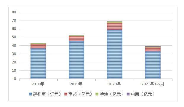 资料显示,安井食品经销模式主要是经销商、商超、特通和电商,但该公司显然更依赖前者。2018年至2020年,通过经销商销售带来的收入为36.43亿元、45.29亿元、58.70亿元,占收入比均为85%左右。也就是说,通过商超、特通和电商渠道合计销售占比不到两成。