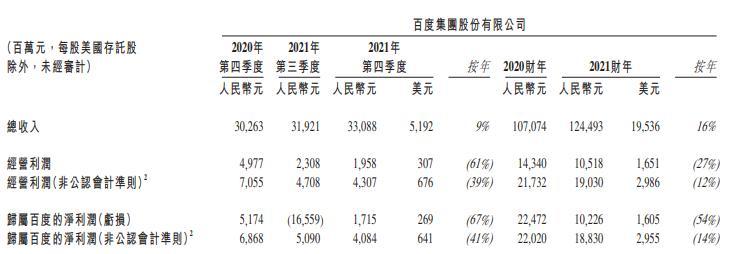 日前,百度披露2021年第四季度及全年业绩。公告显示,2021年第四季度,百度实现总营收330.88亿元,同比增幅9.3%;其中,核心收入为259.78亿元,同比增长12.4%。2021年,百度、百度核心收入分别为1244.93亿元、951.63亿元,同比增幅达16.3%、20.9%。