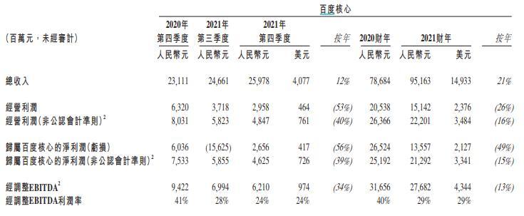 百度核心2021年第四季度及2021财年业绩情况(百万元)