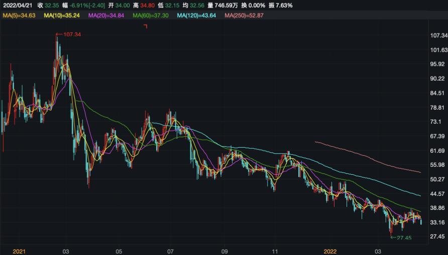Wind数据显示,自2020年12月11日登陆港股上市以来,泡泡玛特股价总体呈下行态势。截至4月21日收盘,泡泡玛特报收于32.35港元/股,较2021年2月17日盘中触达的107.34港元/股下跌69.86%,当前总市值为453.07亿港元。
