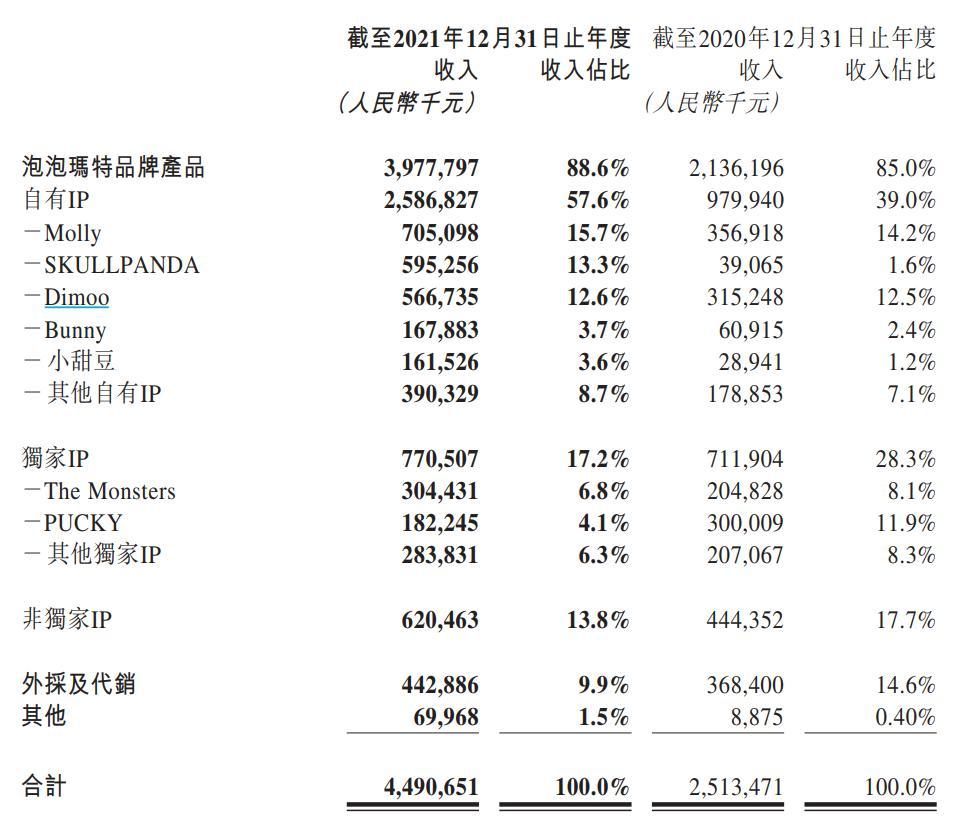 紧随其后的是自有IP中的SKULLPANDA和Dimoo,2021年分别实现收入5.95亿元和5.67亿元,分别同比增长1423.8%和79.8%,占总收入的比重分别为13.3%和12.6%。