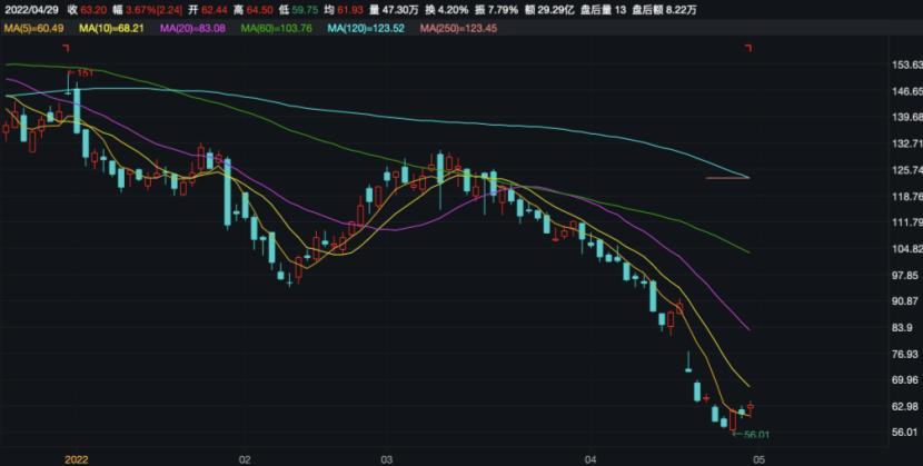 在业绩披露当天,阳光电源股价便应声下落,且在4月21日继续下挫10.54%。截至4月29日,该股收于63.2元/股,较今年1月4日收盘价135.40元/股下降53.32%,总市值较年初缩水1072.32亿元。