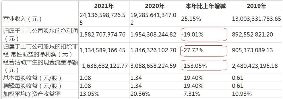 2021年,该公司录得营收241.37亿元,同比增长25.15%;录得归属母公司股东的净利润为15.83亿元,同比下滑19.01%;扣非后归属母公司股东的净利润为13.35亿元,同比降幅达27.72%。经营活动产生的现金净流出16.39亿元,同比降幅深达153.05%。