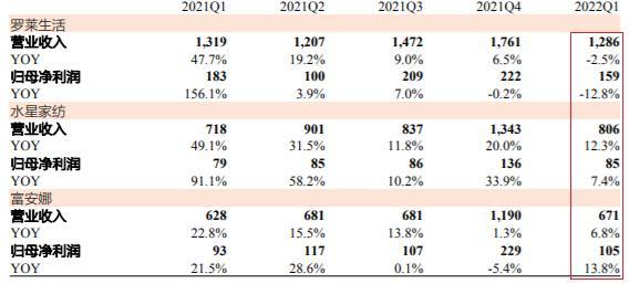 “家纺三龙头”2021年Q1至2022年Q1业绩表现(百万元)