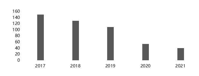 若将上述造成中天金融业绩表现不佳的内部原因拆解来看,据Wind数据显示,近几年,该公司房地产板块收入呈现出连续下滑的趋势,由2017年的149.81亿元下降至2021年的40.92亿元;房地产板块毛利率也由2020年的44.88%下降至2021年的30.92%,同比下滑13.96个百分点。
