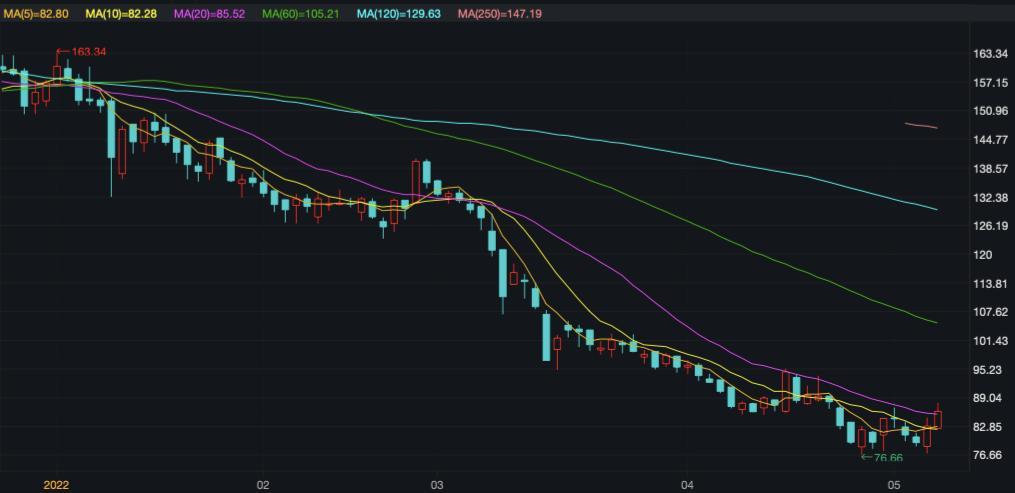 在二级市场上,截至2022年5月10日,传音控股收盘于83元/股(不复权,下同),较2022年1月4日收盘价160.49元/股下降84.28%,总市值665.4亿元。