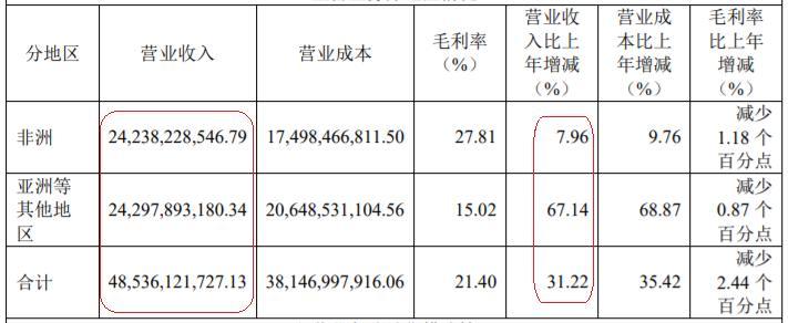 这也是近年来,非洲以外地区收入占比首次过半,而在2019年、2020年,亚洲等其他地区收入占主营业务收入比例为22.75%、39.30%;非洲收入占比则为77.25%、60.70%。但从增速来看,非洲、非洲以外地区均较2020年大幅放缓,要知道2020年前者收入增速为18.14%,后者为159.72%。