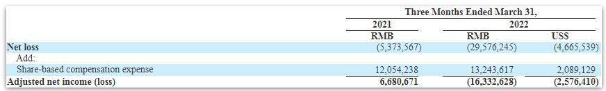 小牛电动2022年Q1净亏损及经调整后净亏损情况(单位:元)