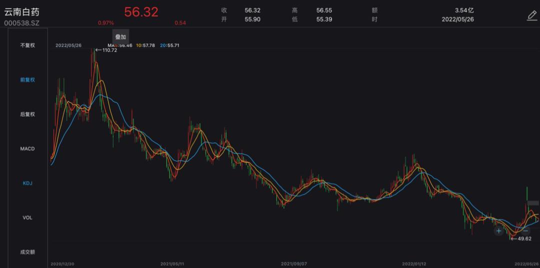 受“千金藤素”影响,该股进入5月后公司股价有所上涨。截至2022年5月27日收盘,云南白药报收于56.26元/股,但与2021年最高点110.72元/股相比仍下跌近半,市值也从2000亿缩减至目前的1010.55亿元,一年多时间蒸发近千亿。