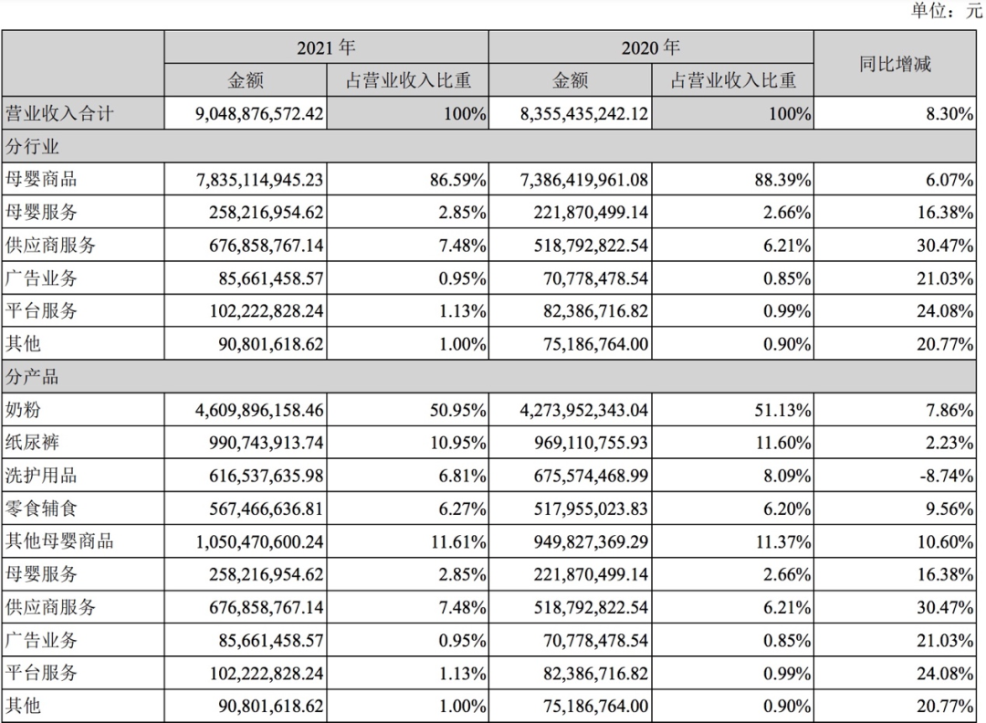 时至2021年,以公司年度总营收为分母计算,孩子王来源于母婴商品的收入占比仍在八成以上,为86.59%;而来源于奶粉的收入占比也仍在五成以上,为50.95%。