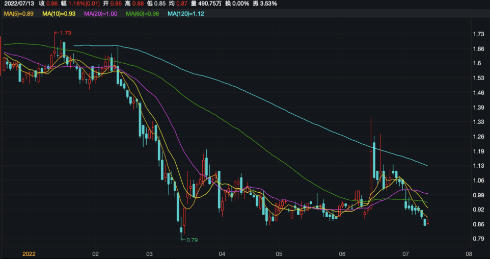 在二级市场上,今年以来,该公司股价便呈下滑态势,并于3月15日一度跌至年内低点0.79港元/股(不复权,下同);此后基本在0.80—1.35港元/股震动。截至7月13日收盘,美图公司收盘于0.86港元/股,市值不到40亿港元。