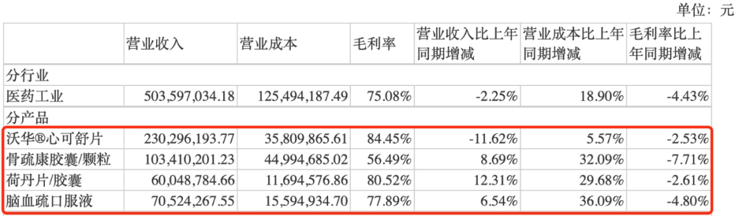 产品方面,公开资料显示,沃华医药构筑了以沃华®心可舒片、骨疏康胶囊/颗粒、荷丹片/胶囊、脑血疏口服液四大独家医保产品为支柱的独家产品线,同时依托上述产品带动其他独家产品及普药的销售。今年上半年,该公司上述四款产品共计实现营收4.64亿元,贡献了当期总营收的92.06%,同时,仅沃华®心可舒片、骨疏康胶囊/颗粒两款产品营收便高达3.33亿元,在当期总营收中的占比高达66.07%,由此可见,沃华医药营收存在过于倚赖主要产品的现象。
