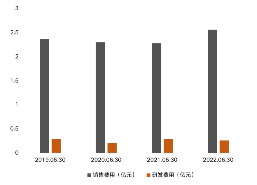反观研发数据则缺乏亮点。今年上半年该公司研发费用仅为2565.11万元,而去年同期则为2863.2万元;同时,该公司近几年研发费用较为稳定,且自2019年上半年以来,各年上半年研发费用并未超过3000万元,亦即叠加来看,近四年各年上半年研发费用仅1亿多元,远远低于销售费用。