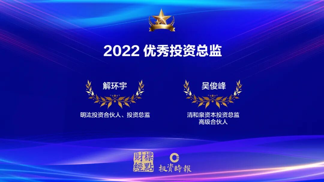 最终,经过激烈的竞争与遴选,一批引领行业未来趋势、敢于突破和创新、经营业绩出色并对社会有突出贡献的企业及个人脱颖而出,获得了褒奖。其中,2家企业的投资总监摘得“金禧奖·2022优秀投资总监”奖项,他们分别是:明汯投资合伙人、投资总监解环宇;清和泉资本投资总监、高级合伙人吴俊峰。