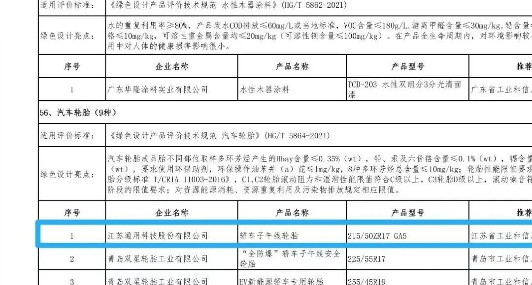 近日,国家工业和信息化部公示了2022年度国家级“绿色设计产品”名单,江苏通用科技股份有限公司千里马215/50ZR17 GA5凭借杰出的绿色环保表现和性能优势名列其中。