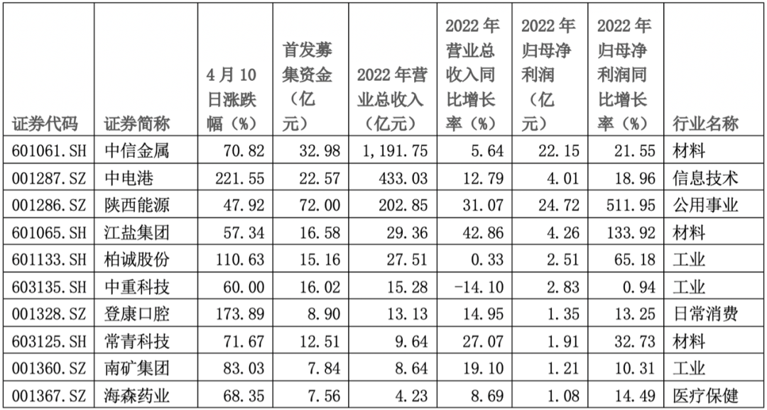 《投资时报》记者查阅Wind数据注意到,10家新上市企业中,3家为材料企业,3家为工业企业,其余分别来自公用事业、日常消费、信息技术、医疗保健行业。从业绩方面来看,10家企业中,有9家2022年营收利润均为正增长,其中不乏利润增速超过100%的公司。