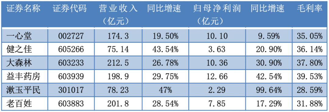 不过,对比一心堂、益丰药房、大森林、健之佳及漱玉平民等同类企业,老百姓的主要业绩指标并不占优。不仅2022年归母净利润增速慢于同业,且同期毛利率水平也处在靠后位置。