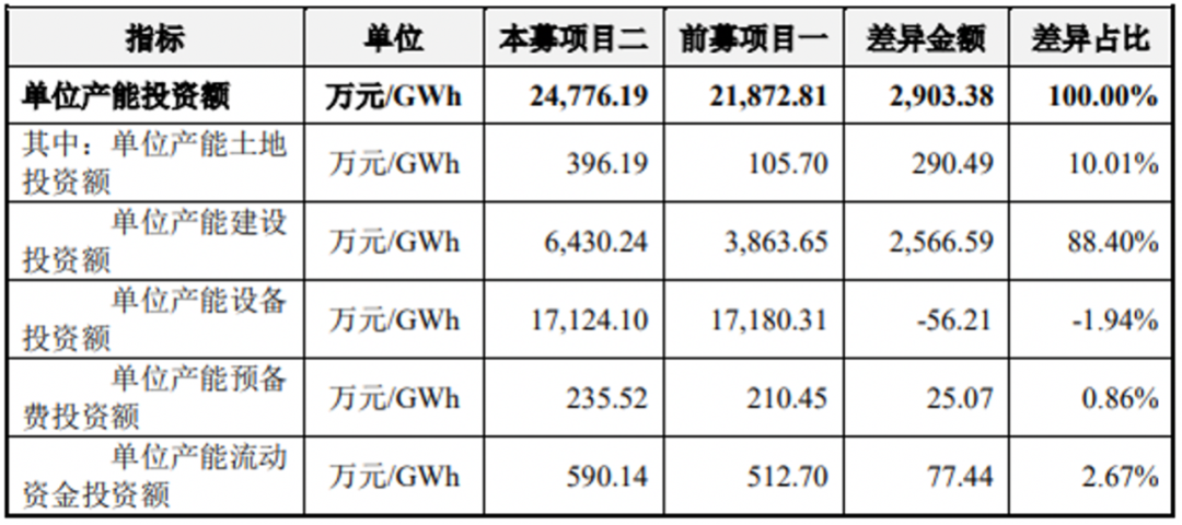 该公司表示,本次募投项目新增产能规模合理、产能过剩风险可控;项目二较前次募投相关项目的单位产能投资额较高,主要是项目实施地、场地建设规划不同所致;同时,考虑到行业正处高速扩容期、在手订单或意向性需求较为确定等,本次融资扩产合理及必要。
