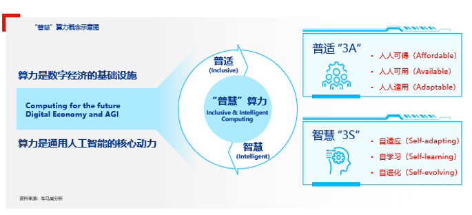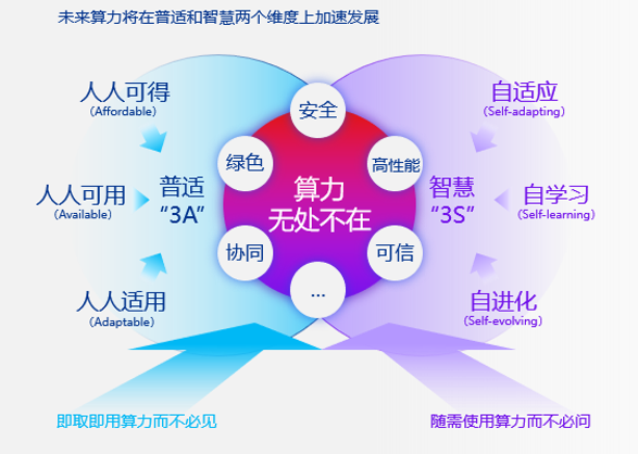 “普适”意味着算力将成为人人可得(Affordable)、人人可用(Available)、人人适用(Adaptable)的“3A”型基础资源,是发展数字经济的基础。“智慧”意味着算力将具备自适应(Self-adapting)、自学习(Self-learning)、自进化(Self-evolving)为代表的“3S”智能,是实现通用人工智能广泛应用、推动数字经济迈向更高阶段的必然要求。
