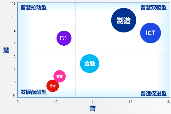 报告以上述三要素为一级指标,并进一步细分成13项二级指标,首次搭建了普慧算力行业评估框架,将各行业的算力需求潜力分为四类,分别是以ICT和制造业为代表的“普慧双驱型”,以汽车行业为代表的“智慧拉动型”,以金融业为代表的“普适促进型”,以及以医疗和教育产业为代表的“发展酝酿型”。