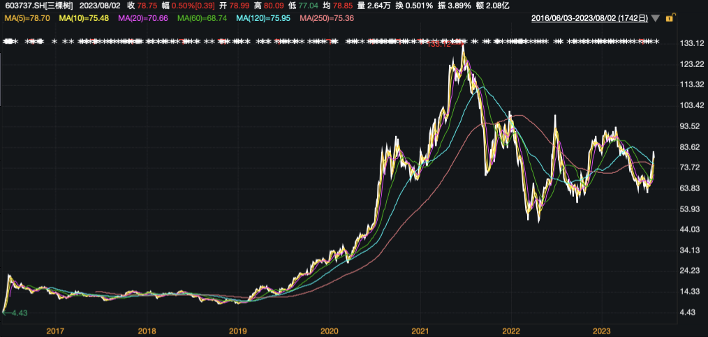 截至8月2日收盘,三棵树报收于78.75元/股,当前总市值为415.02亿元。