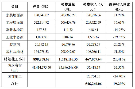 与此同时,该公司家装木器漆、工业木器漆产品及装饰施工业务的销售收入,分别较上年同期减少14.97%、29.87%和24.40%。由于这三项业务分别仅实现448.64万元、1535.67万元和2.38亿元销售收入,金额较低,因此对总收入的增长影响有限。