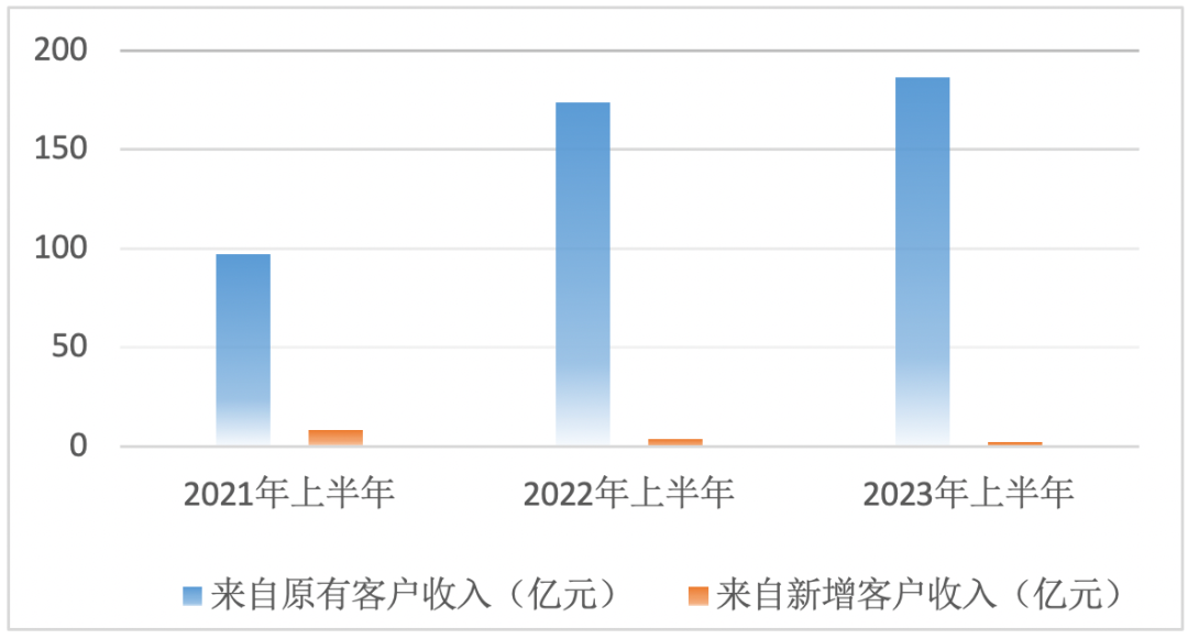 同时,2023年上半年,来自新增客户的收入也缩水至2.2亿元,较上年同期的3.91亿元、下滑近半。粗略计算,新增客户的平均客单价为36.67万元,同比缩水近四成。