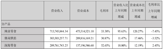 但从各产品的毛利率来看,作为公司营收的主要来源,辣卤零食的毛利率却下滑最为严重。期内,该指标同比下降7.45个百分点,实现33.38%;营收占比约16%的休闲烘焙产品毛利率同比下降3.52个百分点,为30.87%。而在营收占比超10%的产品中,仅深海零食的毛利率上涨2.45个百分点,达到52.65%。