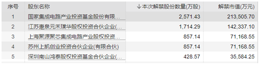 其中,首次公开发行前已发行股份解除限售的股东9户,解禁7086.43万股(占总股本17.16%)。股东中,国家集成电路产业投资基金股份有限公司(下称国家集成电路基金)解除限售股份2571.43万股,解禁股份最多;江苏疌泉元禾璞华股权投资合伙企业(有限合伙)次之,解禁1714.29万股。