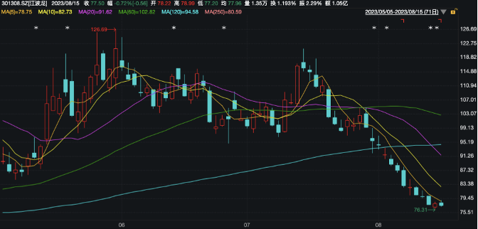值得注意的是,8月7日至11日,A股市场有六十余家上市公司涉及解禁,江波龙解禁市值居首。大规模的限售股解禁对股价造成冲击,截至8月11日,江波龙收盘价为77.76元/股(不复权,下同),较8月2日收盘价下挫15%。而公司此轮股价下行,自7月14日已经开始。8月15日,该公司股价高开低走,截至当日午盘收于76.55元/股,下跌1.93%。