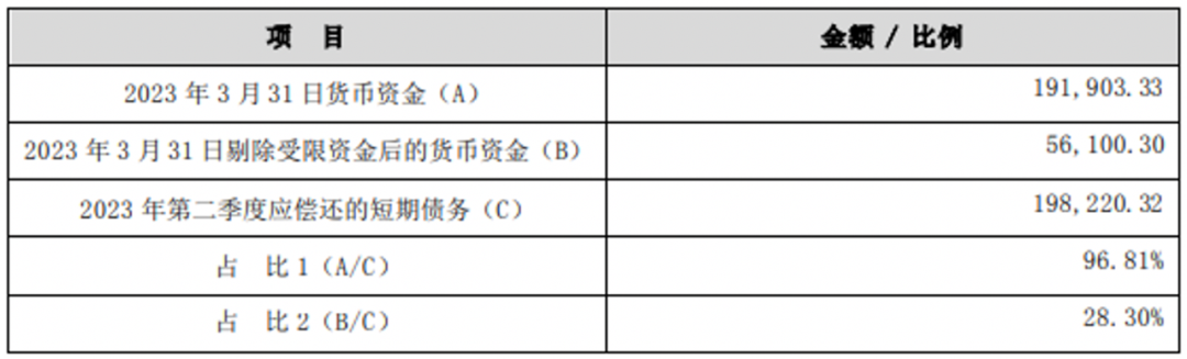截至2023年一季度末,合力泰剔除受限资金后的货币资金仅有5.61亿元,并不足以应对二季度高达19.82亿元的应偿还短期债务