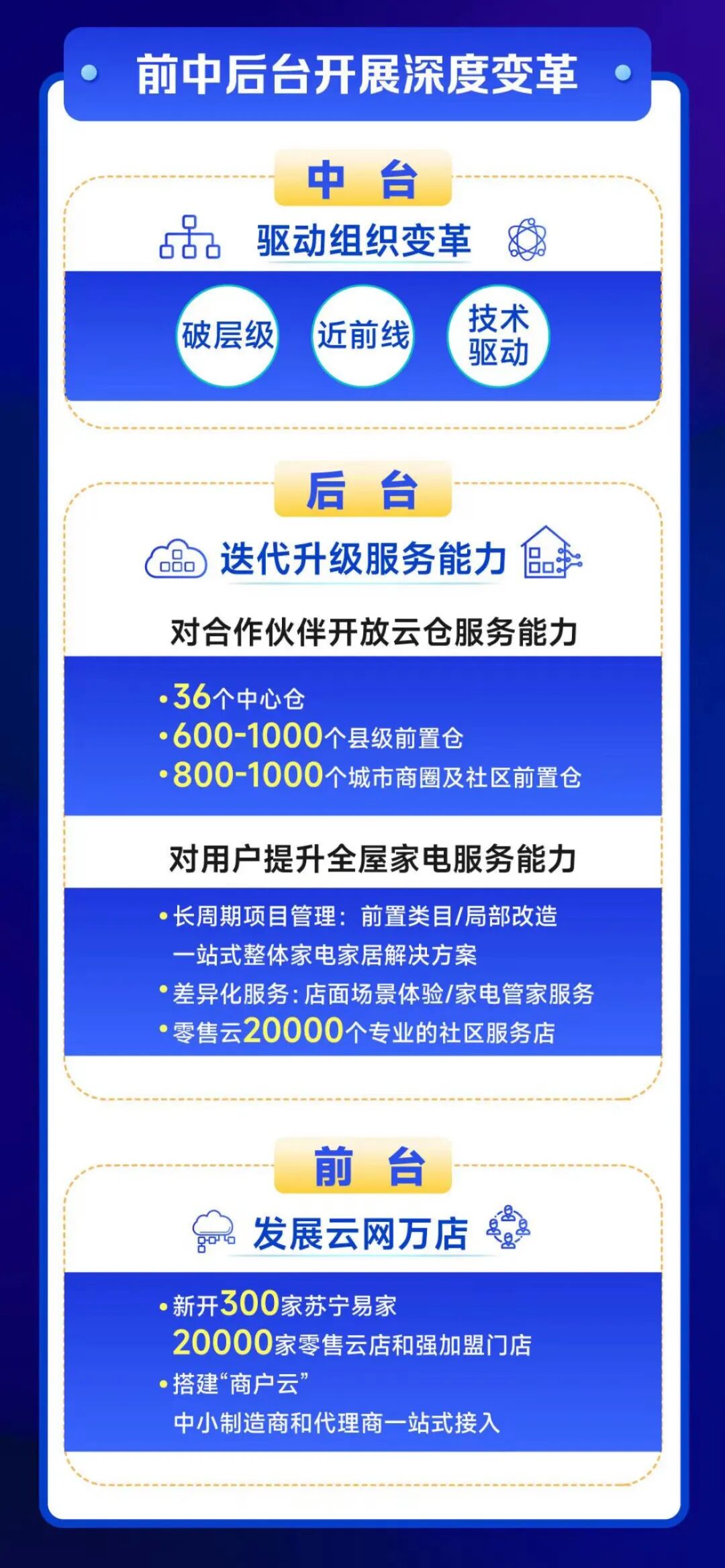 苏宁易购的零售服务商战略,将在前中后台的各个领域,开展触及发展模式、组织管理、核心能力的深度变革
