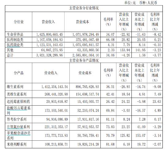 对于这部分收入下降,浙江医药表示,公司主导产品维生素A价格仍处于历史低位,维生素E销量较去年同期有所下降。毛利率方面,生命营养品的毛利率为34.07%,也较上年同期下降了8.42个百分点。