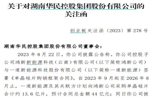 日前,深交所对华民股份下发关注函。关注函要求公司说明,旗下控股子公司鸿新新能源科技(云南)有限公司(下称鸿新公司)终止于2022年底签署的《采购框架协议》的原因是否真实完整,并报备该终止事项的进程备忘录。
