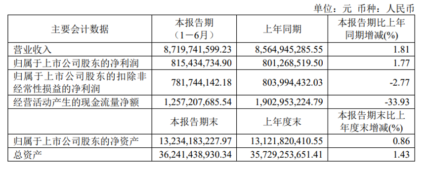 健康元今年上半年实现营业收入87.20亿元,同比增长1.81%;实现归母净利润8.15亿元,同比增长1.77%