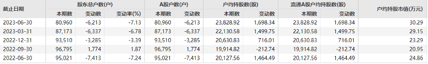 据Wind数据显示,截至今年6月末,健康元的股东总户数为8.10万户,较上季度末减少了6213户,降幅为7.13%,并已连续下降了三个季度,累计降幅为16.36%。健康元最新流通股本为19.29亿股,户均持有流通股数量为2.38万股,较上季度增加1698股;户均持有流通股市值为30.29万元,较上季度增加了1.14万元。