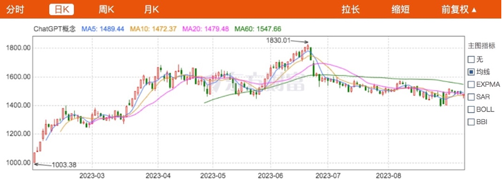 资本市场方面,“ChatGPT”概念板块也于6月20日触及高点后呈现出回落趋势。截至9月6日收盘,该概念板块已较高点跌去近两成。