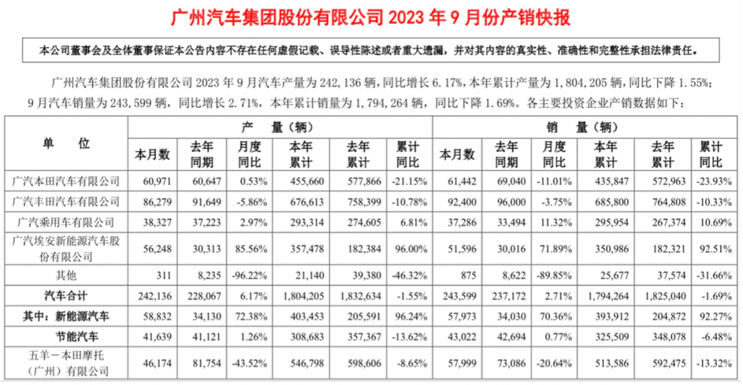 另一方面,广汽集团自主品牌广汽埃安在持续高歌猛进。从最新披露的9月各家新势力车企销量数据来看,埃安品牌单月销量首次突破5万辆大关,同比增长72%,销量排名仅在比亚迪(002594.SZ)之下。今年1—9月,广汽埃安累计销售35.1万辆,同比增长93%。广汽埃安此前制定的年销目标是保50万辆、争60万辆,若按50万辆计算,今年前三季度完成率已达70.20%。