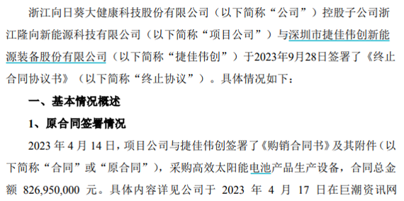 今年4月14日,向日葵控股子公司浙江隆向新能源科技有限公司(下称浙江隆向)与捷佳伟创签署《购销合同书》及其附件,采购高效太阳能电池产品生产设备,合同总金额为8.27亿元。