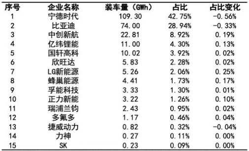 整体上,今年1月—9月,宁德时代、比亚迪国内电池装机量为109.30GWh、74.0GWh,占比为42.75%、28.94%,较前八个月占比变化为-0.56%、-0.33%。