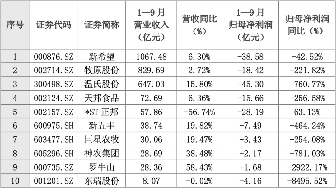 10大A股上市猪企2023年前三季度营收、归母净利润情况