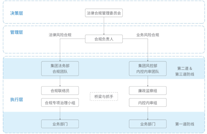 公司发布了《员工行为规范及履责管理办法》《集团总部2023<员工手册>》《高管职业操守准则及管理办法》《高管履行职业操守准则承诺书》《高管亲属关联人申明》等一系列规定,并基于此设置了“决策层—管理层—执行层”三层合规治理架构,其中业务部门为第一道防线,法务部合规团队为第二道防线,风控部内控内审团队为第三道防线。