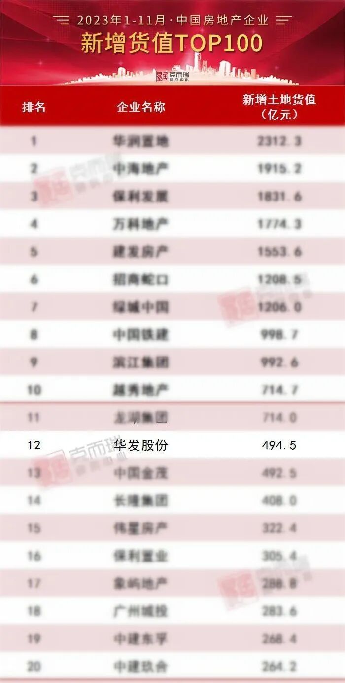 在区域布局上,华发股份聚焦高能级城市,已覆盖粤港澳大湾区、长三角区域、京津冀协同发展区域以及长江经济带等国内主要经济圈。今年1—9月,华发股份积极抢抓土地市场机遇,聚焦符合公司发展战略的优质项目,通过公开竞拍、合作、旧改等方式,斩获16个优质新项目,均位于上海、广州、深圳、成都、杭州等一线、强二线城市及大本营珠海。据克而瑞2023年1-11月全国房地产企业新增货值排行榜显示,华发股份新增货值494.5亿元,排名第十二位。