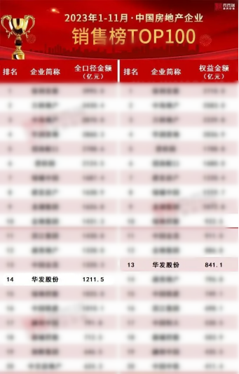 在克而瑞发布的2023年1—11月销售排行榜上,华发股份全口径金额为1211.5亿元,同比增长18.31%,位列榜单第14位,较2022年同期提升5位。从数据来看,华发股份前11个月的全口径销售额已超过去年全年的1202亿元,实现了在销售端的持续突破与稳步增长,再度延续了作为千亿房企的销售佳绩。