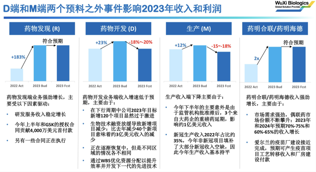 药明生物认为,在药物开发端,公司达不到在下行周期中完成新增120个项目的2023年目标,同时受生物技术融资放缓影响,公司新增项目比去年减少40个,意味着约3亿美元收入的减少。在生产端,受下半年监管机构批准滞后影响,3个来自大药企的重磅药物生产延期,影响约1亿美元收入。此外,公司2022年新冠项目收入上涨逾35%,今年非新冠项目填补了大部分空缺,因此今年生产收入基本持平。