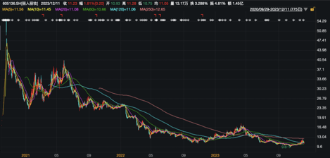 二级市场方面,丽人丽妆股价在2020年10月23日触及55.28元/股(不复权,下同)历史高点后,一路震荡下行。截至2023年12月11日,该公司股价报收于11.23元/股,这一价格已跌破当年12.23元/股的发行价,目前45亿元的市值较三年前最高市值已缩水177亿元。