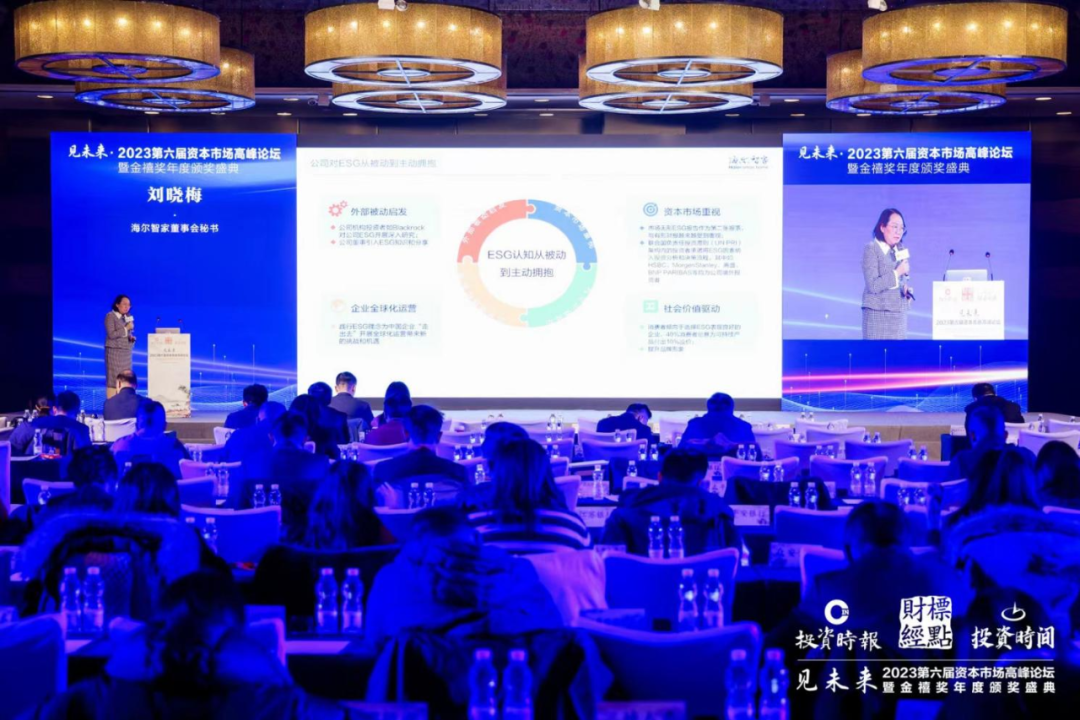12月20日,由《投资时报》等主办的“见未来•2023第六届资本市场高峰论坛暨金禧奖年度颁奖盛典”在北京举行。会上,2023年度金禧奖公布,海尔智家一次获得“2023美丽中国双碳先锋”、“2023ESG绿色公司之星”、“2023卓越社会责任企业”三项ESG大奖,是行业ESG获奖数量最多的企业。