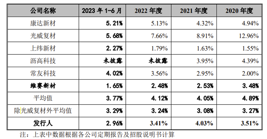 但从公司研发投入来看,报告期内,该公司的研发费用率分别为3.51%、4.03%和3.41%,始终低于同期可比公司4.89%、4.05%和4.12%的平均水平。此外,截至招股说明书签署日,佑威新材拥有发明专利3项、总专利数67项。3项发明专利取得时间均为2018年,此后再无新增发明专利,并且其中一项含有环氧树脂的脱模布的回收利用方法的发明专利为继受取得,并非公司原创。而可比同业公司中,同期康达新材(002669.SZ)发明专利为125项,总专利数234项;光威复材(300699.SZ)发明专利为35项,总专利数621项。比较来看,佑威新材的发明专利数竞争力较弱。