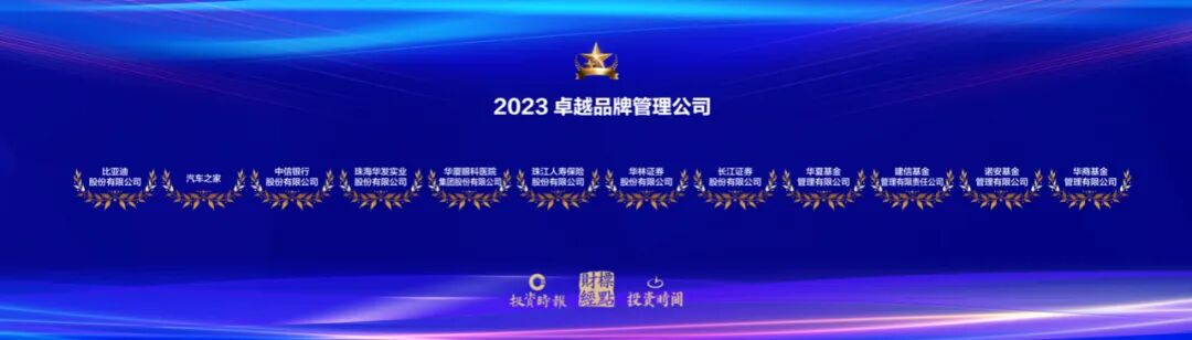 其中,14家企业摘得“金禧奖·2023卓越品牌管理公司”奖项,他们分别是:比亚迪股份有限公司、汽车之家、中信银行股份有限公司、珠海华发实业股份有限公司、华厦眼科医院集团股份有限公司、珠江人寿保险股份有限公司、华林证券股份有限公司、长江证券股份有限公司、华夏基金管理有限公司、建信基金管理有限责任公司、诺安基金管理有限公司、华商基金管理有限公司、银河基金管理有限公司、睿远基金管理有限公司。