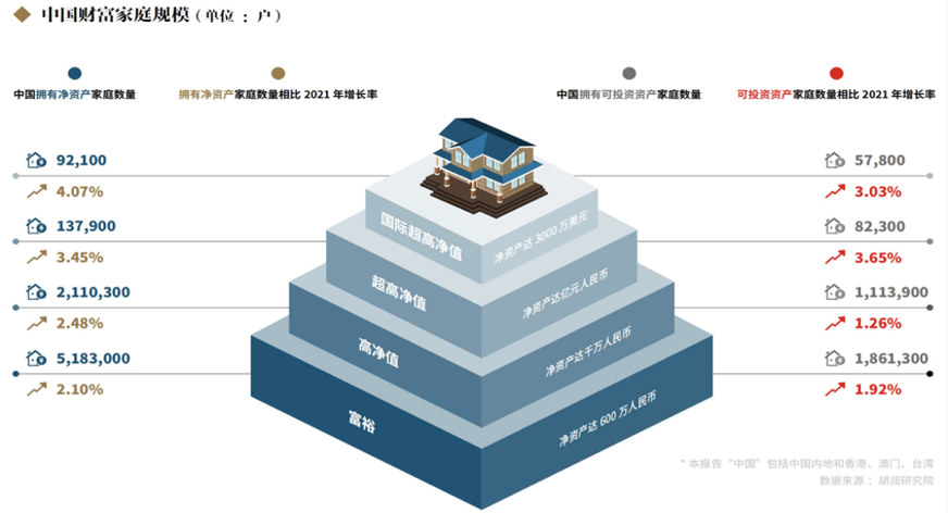 中信保诚人寿与胡润研究院联合发布的《中信保诚人寿「传家」·胡润百富2023中国高净值家庭现金流管理报告》显示,中国拥有600万家庭净资产的“富裕家庭”数量达到518万户,比上年增加2.1%;拥有千万家庭净资产的“高净值家庭”数量为211万户,同比上年增加2.5%;拥有亿元家庭净资产的“超高净值家庭”数量达到13.8万户,同比增长3.5%;拥有3000万美金的“国际超高净值家庭”数量为9.2万户,增长4.1%。